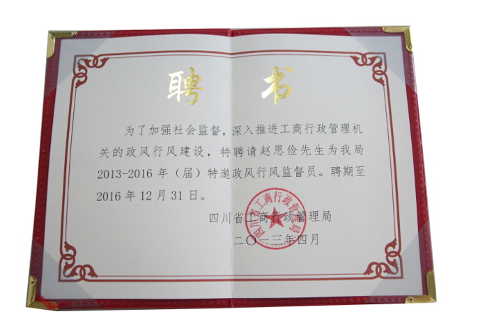 5月,為加強社會監督,推進全省工商行政管理系統的政風行風建設,四川省工商行政管理局聘請了2013-2016年(屆)特邀政風行風監督員,集團趙董事長作為企業家代表也獲邀請。此次特邀的監督員包括省政協委員、省直機關工委巡視員李成林;省政協委員、省政法委巡視員賈月成等14位來自省內政界、商界、媒體的代表。特邀監督員人選由省級工商局請政府糾風工作主管部門推薦,經征求本人意見后正式聘請并頒發聘書和證件。