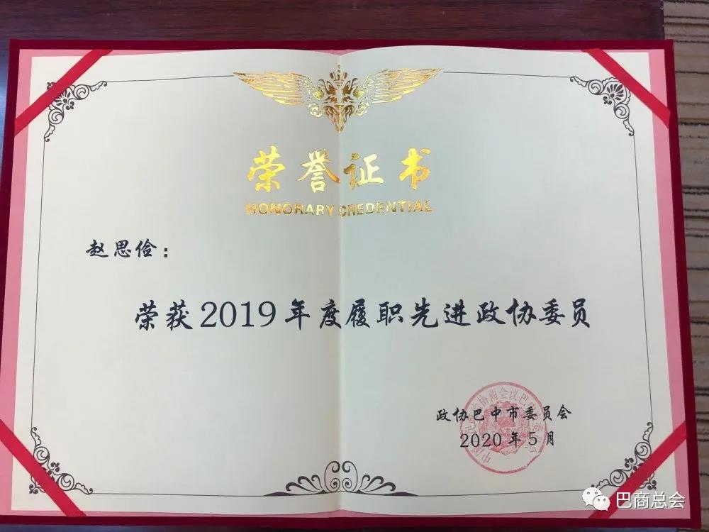 巴商總會(huì)會(huì)長(zhǎng)趙思儉當(dāng)選為政協(xié)巴中市第四屆委員會(huì)常務(wù)委員,并榮獲2019年先進(jìn)政協(xié)委員。