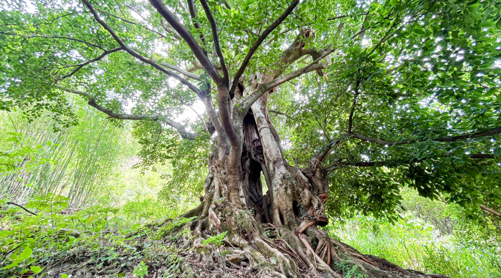 古樹資源也是?;系囊淮筇厣m椖糠秶鷥扔薪?00棵數百上千年的古樹沿主要道路呈帶狀分布,專家一行參觀的是園區的“千手觀音子母樹”和“七星古樹”。子母樹為同根而生的雙生樹,母樹根系在十余米外再次萌芽,生長為子樹。二者根系相連、枝葉相接、風姿相似,因母樹枝干如手臂向四周伸展,神似千手觀音,故被當地村民稱為“千手觀音子母樹”。“七星古樹”因生長方位分別與北斗七星——天樞、天璇、天璣、天權、玉衡、開陽、瑤光對應,故此得名。每年農歷三月三,七里八鄉的村民在此舉行“斗菜節”,祭祀樹神祈福新年。